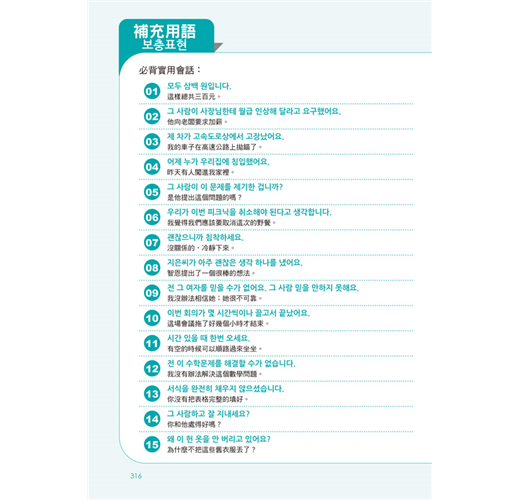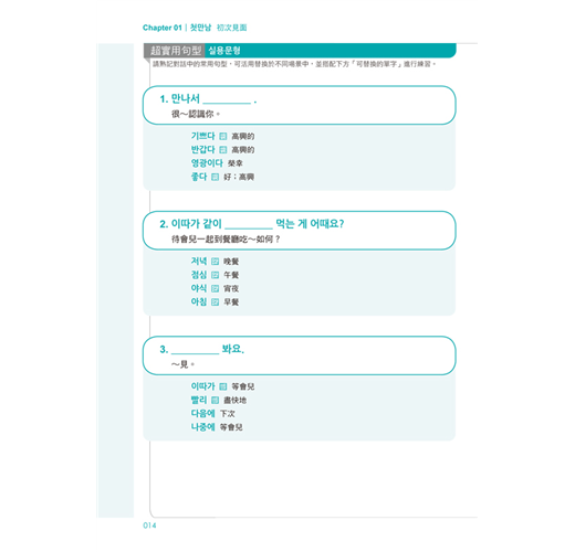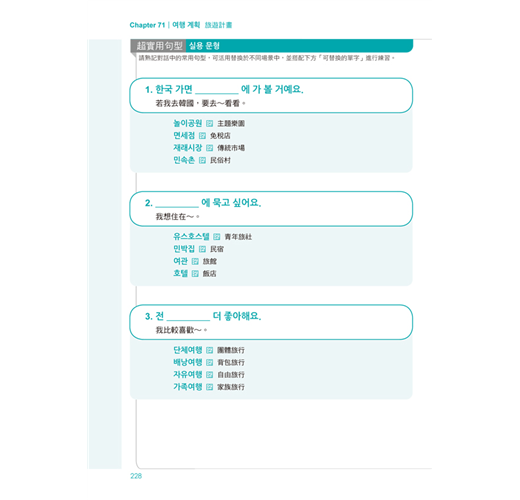 每篇對話練習使用三組實用句型,並補充句型中可替換的單字,讓你更懂得靈活運用韓語,快速熟悉韓語語感!