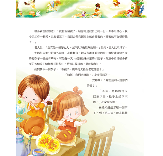 安娜問:「麵粉是別人送你們 的嗎?」 「不是,是媽媽每天回家以後,從手上搓下來的。」小女孩答道。