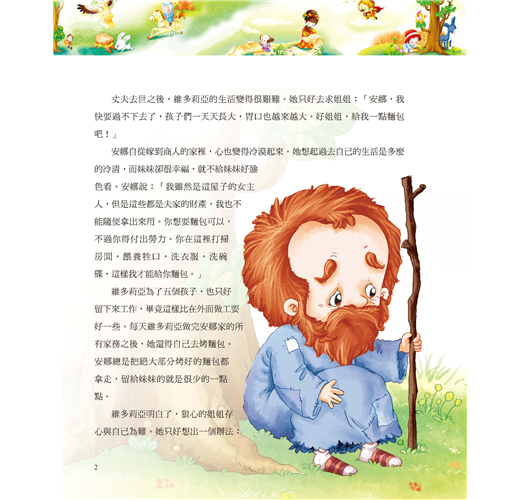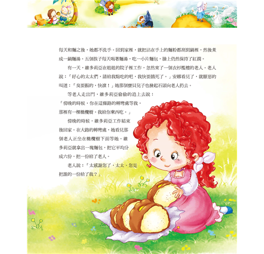 老人說:「您真是一個好心人,也許我以後能幫助您。」說完,老人就不見了。 安娜每天都只給維多莉亞一小塊麵包,她以為維多莉亞的孩子很快就會像外面的野孩子一樣瘦骨嶙峋。可是有一天,她路過妹妹家的小院子,無意中看見維多莉亞的五個孩子個個都長得很好,臉蛋紅撲撲的。她吃驚極了。