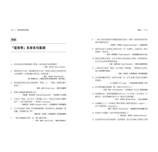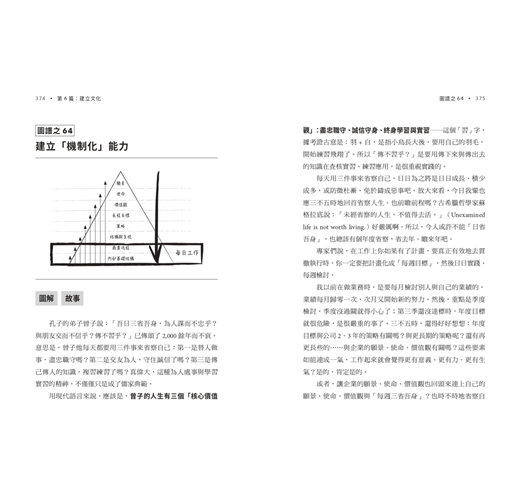 本書共有72張圖,佐以許多有趣的故事軼聞,娓娓道來上述四個價值觀的內涵精要,再延伸到企業/組織文化、社會文化,再進一步提升到當責文明,一氣呵成。這是一條漫漫長路,卻是一脈相傳、一以貫之。72張圖上下連接延繫宛如一道光譜,譜中各節點有圖、有故事,相輔相成、相得益彰。在領導自己與領導別人上,當責也開啟了一系列相輔相成的軟實力,幫助你從圖中體悟出成功的事業與人生。