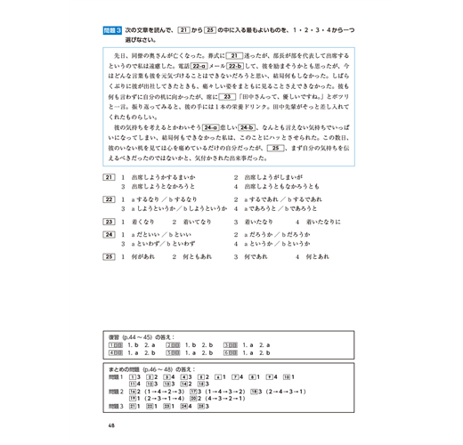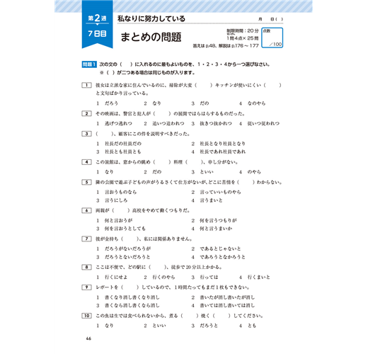 完成每日份量後,立刻上場刷題,確實掌握學習狀況;尤其每週第7日的「まとめの問題」,採日檢形式出題,25道題目,限時20分鐘,書末附有詳解。透過每日小練習,每週大複習,自我檢核學習成效,同時熟悉日檢題型,信心倍增。