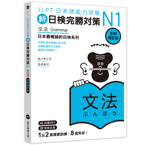 本系列因其簡單易懂的特色,引導學習者循序漸進、養成實力,上市以來,一直是日檢類的冠軍書。全新增訂版的《新日檢完勝對策N1:文法》,維持以日常生活為主題發展N1相關句型,「備考」與「實用」功能兼具。每日以形態、意思或接續方式類似的3~4個句型為一主題。學習目標明確,同時也能辨別運用上的差異,以8週完成訓練目標。