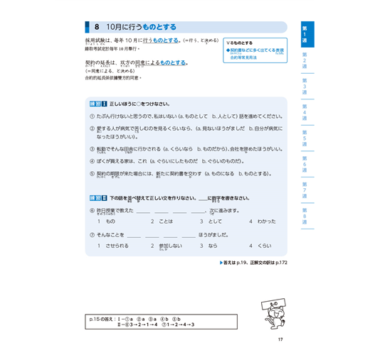 【練習題解說】全書所有題目都有中譯或解說,置於書末不干擾老師教學,同時也方便自學。此外,解答以完整正確句子呈現,並標上假名注音,熟讀句子可加深、加廣學習。