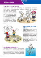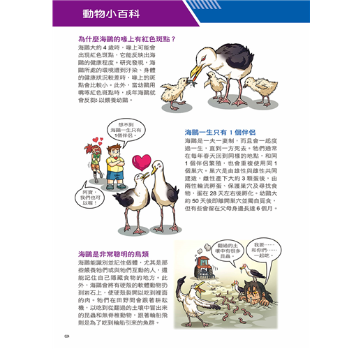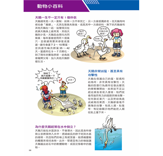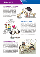 設有「動物小百科」單元,特別介紹鷗屬動物和天鵝屬動物的構造與小常識,以及為什麼海鷗經常跟在輪船和耕耘機後面、太平洋鷗嘴巴尖端的紅色斑點讓牠看起來像塗了口紅、喜歡吃櫻桃的加州鷗是潛水獵捕的高手、外形優雅的天鵝其實個性凶猛且具有攻擊性、如何分辨外觀和體型都很相似的黃嘴天鵝與小天鵝、喙上有紅色肉瘤的黑頸天鵝喜歡把孩子揹在背上游泳等動物的超炫常識,讓小朋友有系統的學習。
