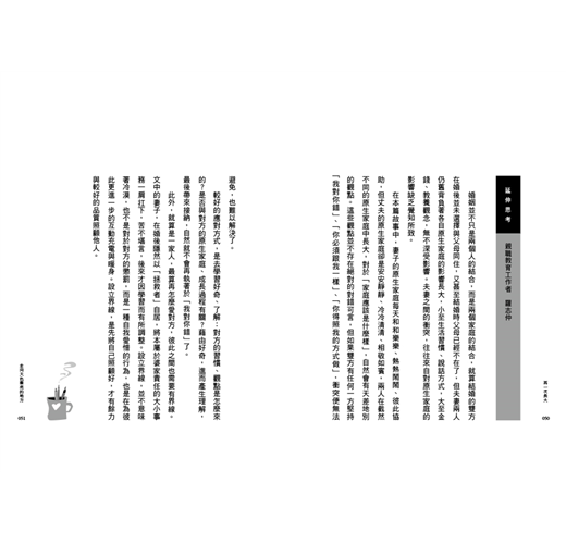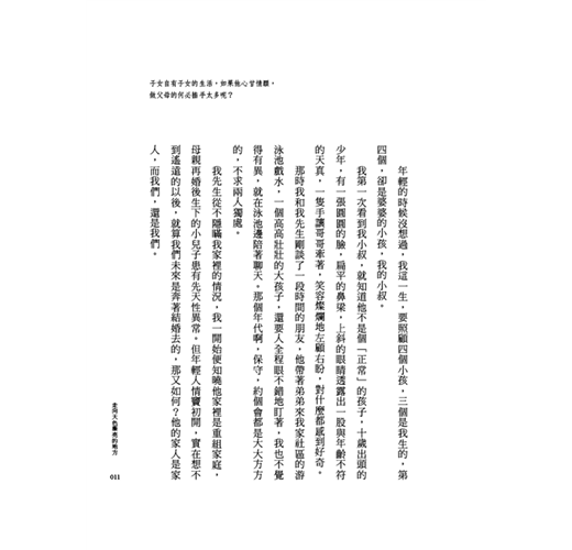 本書以「親子關係」為主軸,探討親子之間的「情感索求」、「適時放手」、「理解與尊重」、「自我認同」等四個面向。