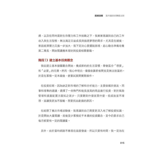 沒有高學歷和富爸爸的他,經過閱讀近千本財經書籍和多篇論文後,將其中精華融會貫通,並以虛擬交易先做測試,再用實際金錢進行操作,從而創造出獨特的投資手法,現已擁有數千萬元身家。他認為成功投資的關鍵在於「商品特性」、「交易策略」和「風險管理」,若能善用這三大利器,就有機會獲得超級回報,成為股市賺錢贏家。