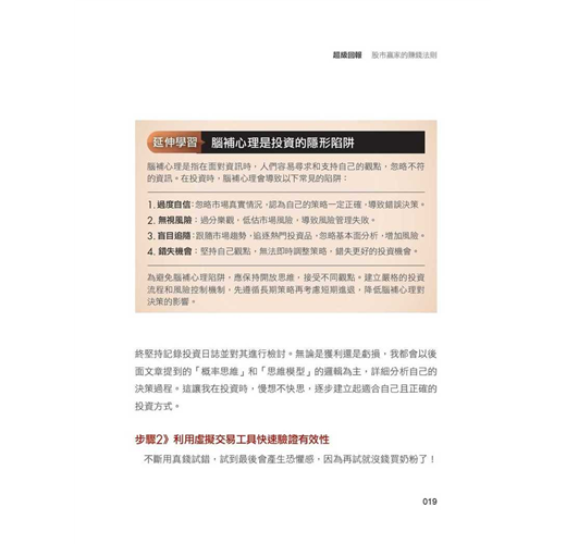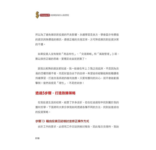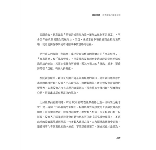 在瞬息萬變的金融市場裡,如何在風雨飄搖中穩定獲利,又能在市場波動中洞悉先機?一直是投資人追求的目標。本書為大家提供一個全面而深入的投資知識體系,幫助讀者提高獲利技能,理解投資原理,建立良好的交易心態,讓你在投資路上走得更加穩健。