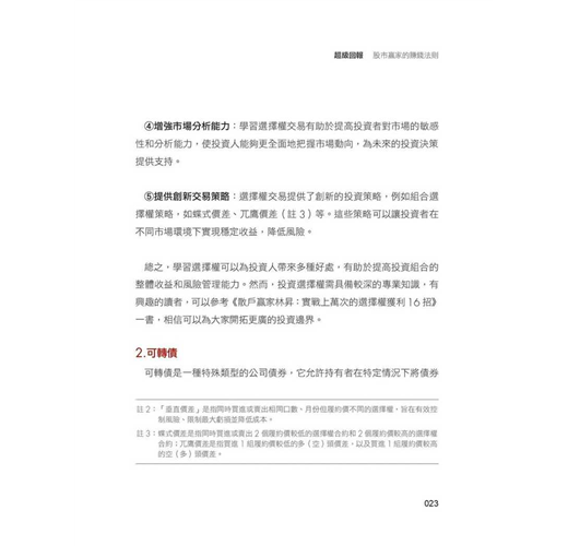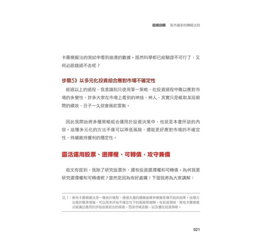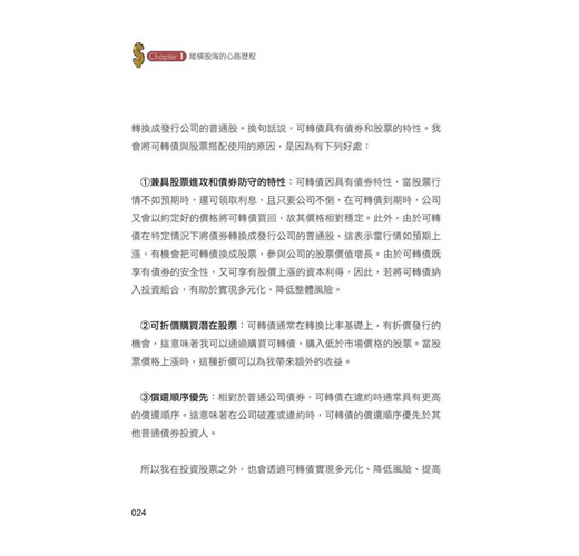 第5篇「穩紮穩打的實戰技巧」,透過分享一系列實用的投資技巧和策略,例如追求穩定收益3寶:特別股、美國公債、可轉換公司債(簡稱「可轉債」);利用反身性理論掌握超額獲利時機;利用因子投資追求高報酬率;以及判斷交易時機的4種方法等,讓讀者在投資實戰中能夠更加得心應手,逐步提高投資收益。