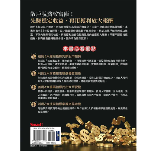 散戶多希望以小搏大,常將資金壓在高風險的資產上,只是一旦出錯容易滿盤皆輸。本書作者有15年投資經歷,從小職員翻身賺進數千萬元身家,他認為散戶如果想成功致富,不妨先賺取穩定收益,再將獲利投資在較高風險的資產放大報酬!只要不斷重複這過程,就有機會扭轉輸錢命運,翻身成為股市贏家!