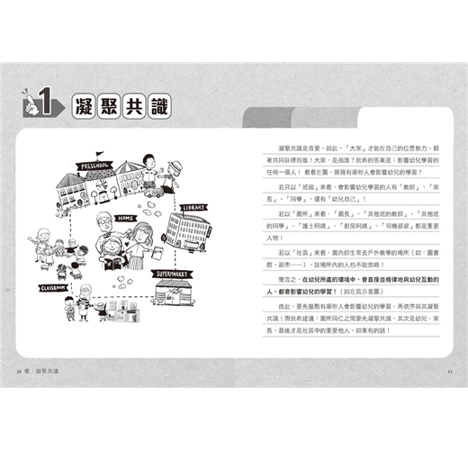 即使無須與另一位夥伴協同教學,若能與園內的工作夥伴(主管、其他班的教師、廚房阿姨、司機叔叔……)越有共識,越能一起帶著幼兒邁向理想——讓幼兒感受到閱讀的趣味及其與生活的關聯。而且需要凝聚共識的不只是「工作夥伴」,還有「家長」呢!