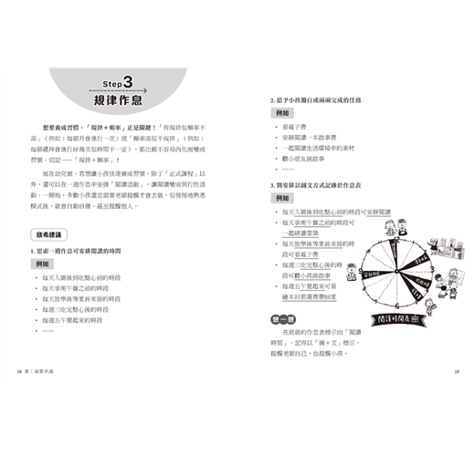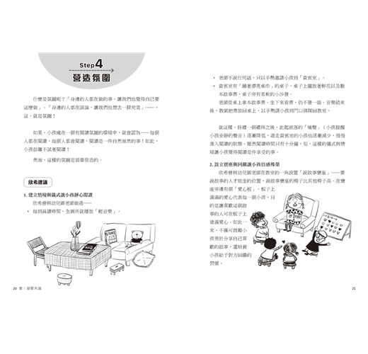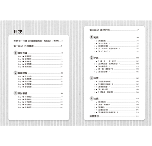 「學習活動」則精選適合幼幼班、小班、中班、大班課程與學習領域的繪本,示例說明。每個參考示例包含:1.解讀文本,帶領老師思索教學方向;2.搭配「幼兒園教保活動課程大綱」,挑選適合的領域、課程目標、學習指標,設計系列活動,以聚焦學習。3.協助教師如何做好課程準備以啓動學習,像是示意圖,或是教室布置、或是課程進行、或是教師在白板上的書寫、或是紀錄單……讓大家更清楚可能的做法!