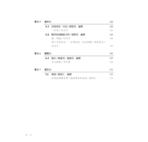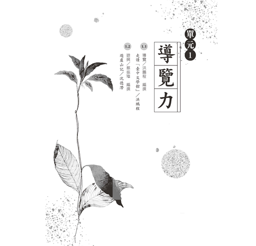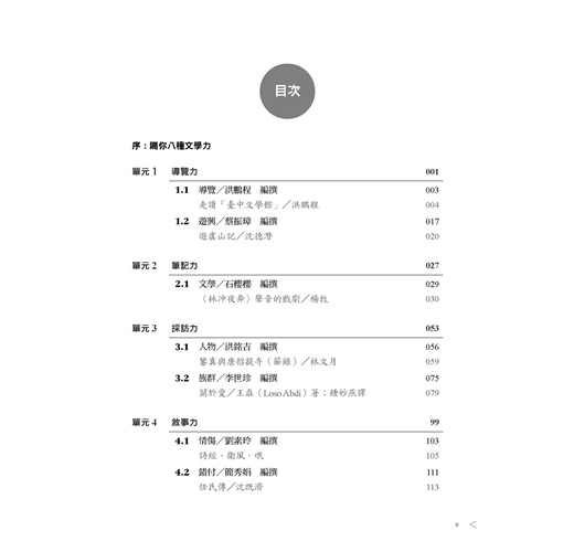 從目次上看,共賜你導覽力、筆記力、採訪力、敘事力、創作力、體察力、聲引力等七種文學力。其實,各單元間還藏了五篇文言課文,期望能一點一滴地累積文言力,在不知不覺中,取得開啟中華文化智慧寶庫的鑰匙。