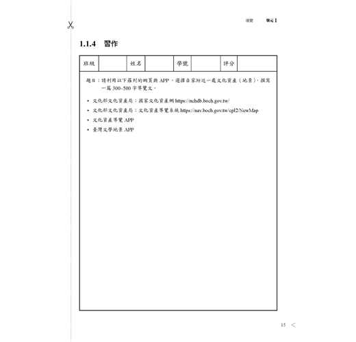 版面格式留有筆記及心得欄位,以扎實的筆記訓練摘要書寫為基礎,使思路清晰有條理的敘事;表達應用到導覽解說景物,或採訪人物族群,鼓勵多元視角,擴大社會參與;並加深文史底蘊與人文關懷,以提升競爭力。