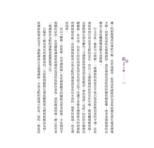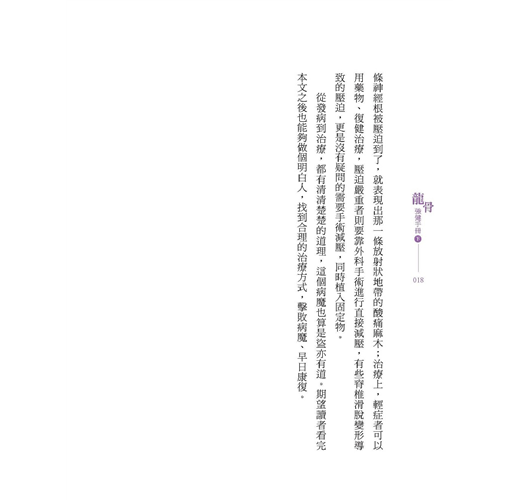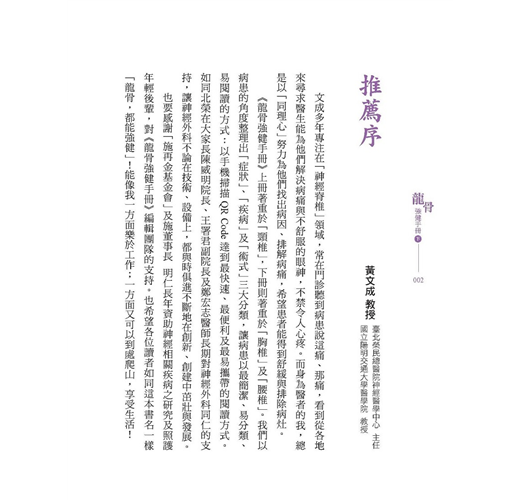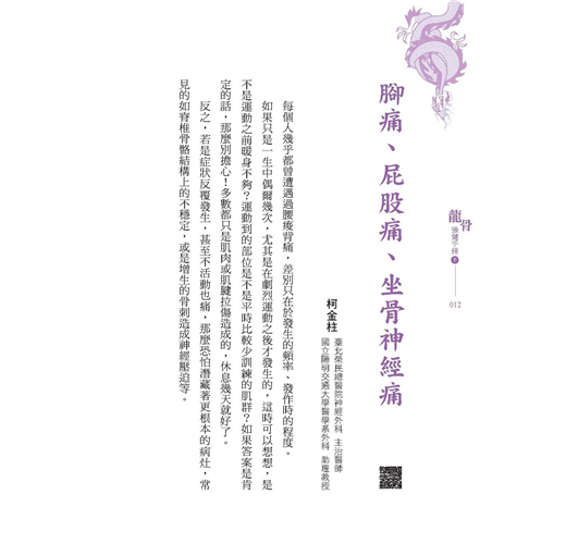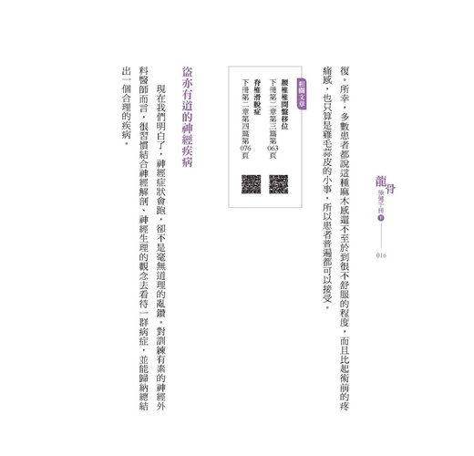 《龍骨強健手冊》上冊著重於「頸椎」,下冊則著重於「胸椎」及「腰椎」。我們以病患的角度整理出「症狀」、「疾病」及「術式」三大分類,讓病患以最簡潔、易分類、易閱讀的方式:以手機掃描QR Code 達到...