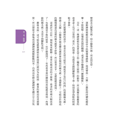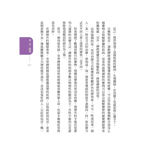 本書完全以病人或家屬閱讀的觀點來設計,試圖針對大多數的神經脊椎疾病,提供病人就醫前後的指引以及參考資料,盡量把大部分艱澀的醫學名詞以及知識,轉換成日常口語給大多數的民眾閱讀,章節後附上少量的參考文獻,以供更深入的科學知識傳達。
