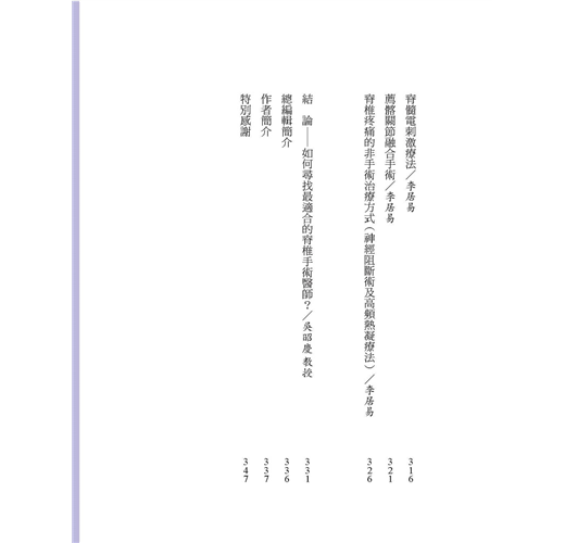 臺北榮總神經外科、神經復健科領域上熱血及專業的醫生們,依過往接觸案例歸納整理以「症狀」、「疾病」及「術式」三大分類,希望能透過本書快速讓普羅大眾能夠得到最與時俱進的脊椎養護知識,且在醫病關係上能更有效與快速溝通,盼能藉此幫助大家與做好龍骨保健。