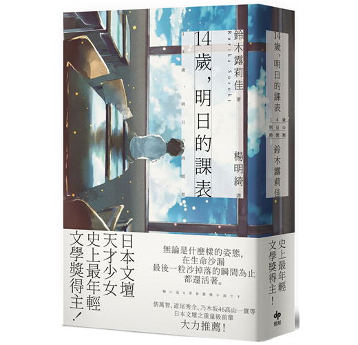 這是一本年輕作者的短篇小說集成,書名用了《14歲,明日的課表》,每一篇的主題雖是用課堂名稱,但是內容上超乎作者的實際年齡。看得出來作者要表達的重點是:『雖然是14歲的課表,但卻是未來生活提前寫照。』而每一則短篇都有作者和家人、鄰居、老師、同學等周遭相關人物相處的故事。作者觀察入微,文筆流暢,閱讀起來可感受到滿滿的情感和對未來生活的憧憬。正如故事中出版社編輯片瀨小姐所說:「小說在文學領域中,是最有可能青出於藍的一塊。」作者正是所謂的青出於藍的天才小說家。
