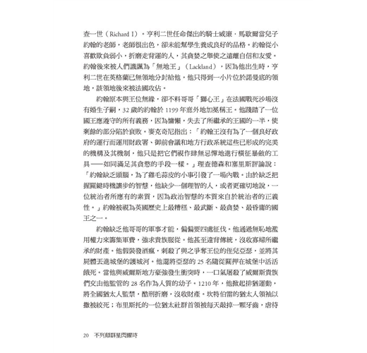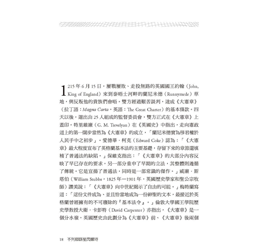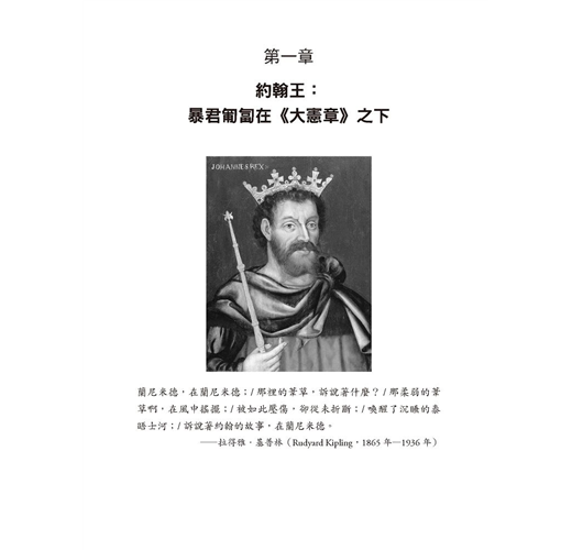 我選擇了15 個人物及其創造的歷史性時刻,除了第一個人物「無地王」約翰,其他14 個都是「正面人物」(約翰王雖然是「反面人物」,卻做了一件對英國憲政進程影響深遠的好事—簽署了《大憲章》,儘管他不情不願且很快反悔。上帝如此幽默,祂有時會揀選壞人來完成美好的事情。)我的選擇本身就帶有強烈的褒貶和臧否,任何一個作家在敘述歷史與現實時,都不可能實現所謂的「客觀中立」,反之,主觀性或個性越強的敘述才越有價值。