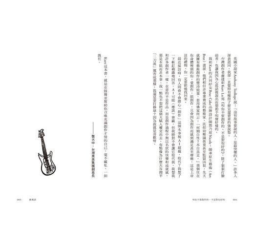 最近採訪時,有人問會不會擔心「創作」這個本事被AI超越、取代?我想了一下斬釘截鐵地回答,AI可能(應該)會贏,但我絕對不會讓它取代我。我想我和許多創作者一樣,在意的不是作品,而是創作過程中無以名狀的快樂和成就感,那是本能而非本事,我一點也不想把這個天賦人權交出去。有點像為什麼大谷翔平「二刀流」厲害成那樣,我還是要打棒球?因為我就是喜歡呀。