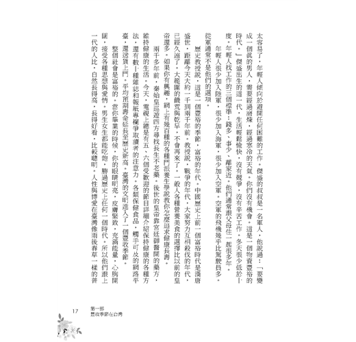 第一冊是臺灣的故事,第二冊是中國與臺灣的互動,第三到第六冊是中國的主題故事。本書的章節裡面(B#)代表分開另外一個話題,因為越說越遠,只好分列一個岔開的話題,B代表分支branch(岔開),或者咖啡時間,或喝茶時間(tea break),暫停。