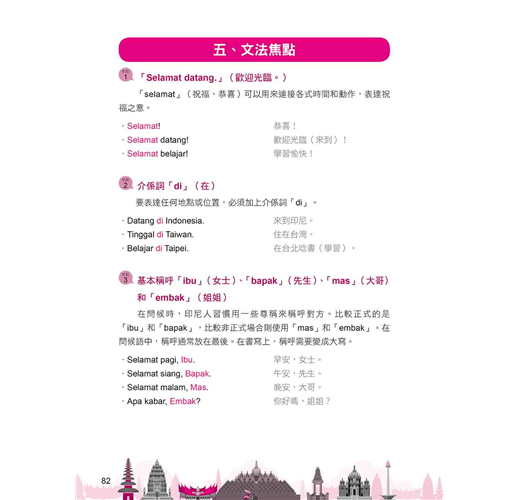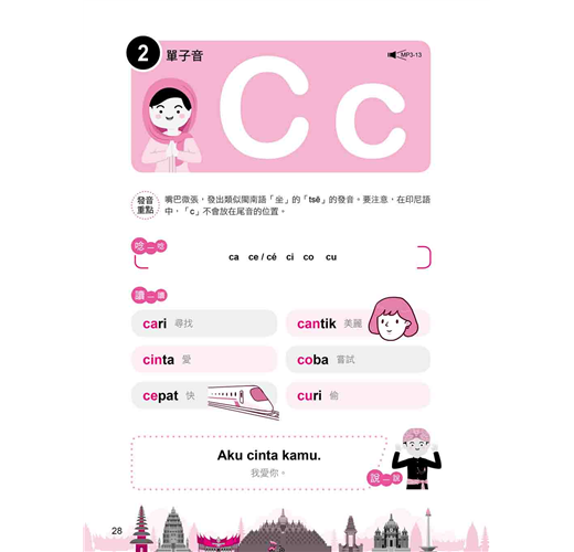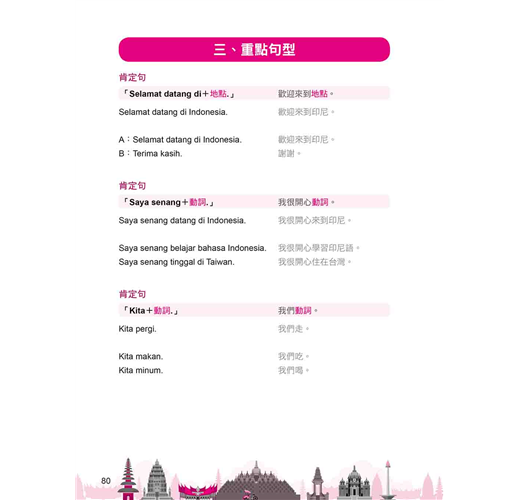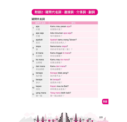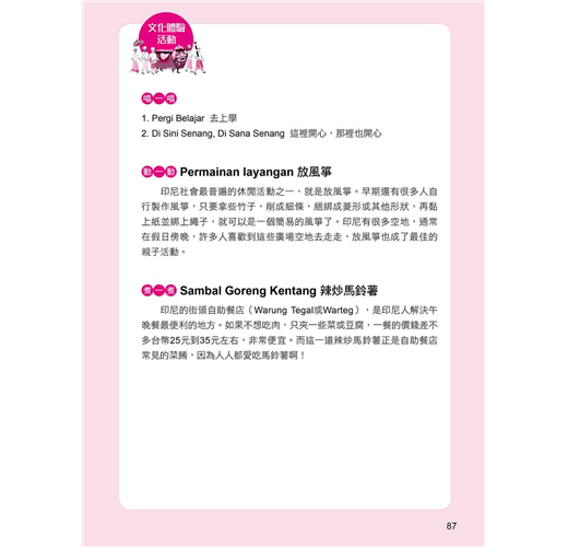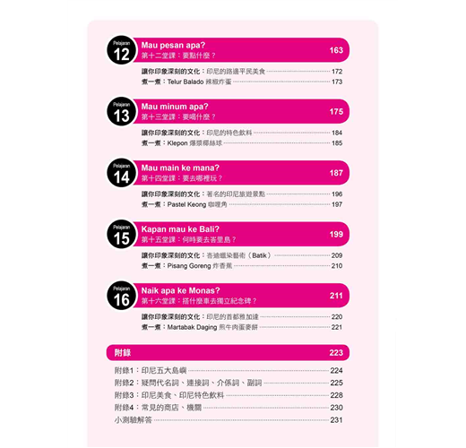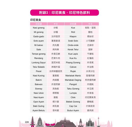 ˙學文化:本書貼心「附錄」幫你整理印尼各大島嶼、美食飲品、建築物等單字表,想增加字彙量的你,別忘了善加利用喔!