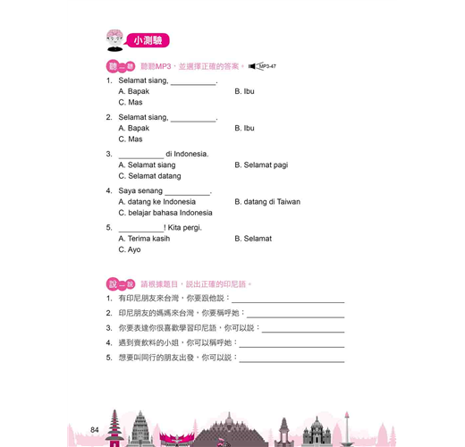 STEP 5「小測驗」:學完課程後,是否躍躍欲試呢?想知道自己的印尼語實力,就快用「聽一聽」、「說一說」、「讀一讀」、「寫一寫」驗收成果!四大能力,就是要一次備齊!