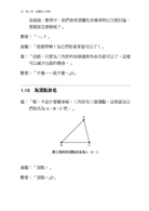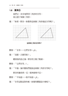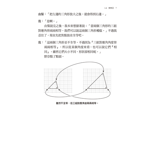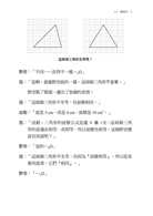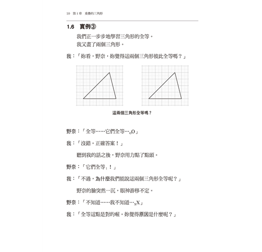 以對話形式講解三角形全等的條件、等腰三角形、正三角形、直角三角形、平行線的內錯角與同位角等相關的問題,並一步步推進思考。