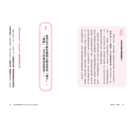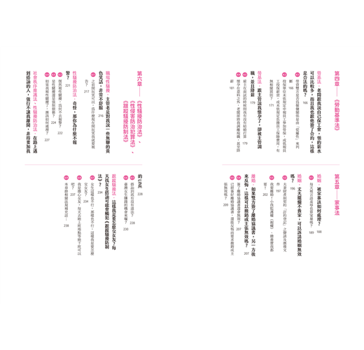 本書章節以法規類型做分類,內容引知名案件或常見法律問題做解說,讓讀者更有共鳴。