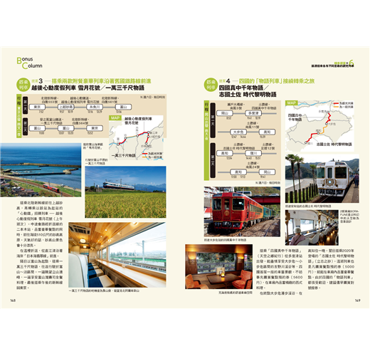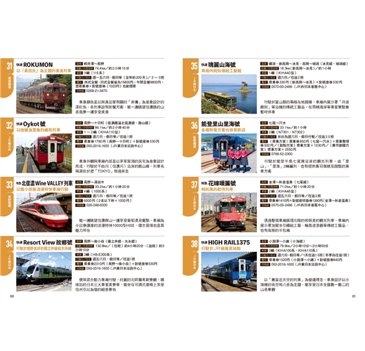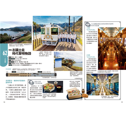本書按照北海道、東北、關東、中部、近畿、中國、四國、九州來介紹各地區著名的觀光列車,透過精彩的圖文解說了解多款列車的獨門特色,亦有搭乘觀光列車之旅的轉乘提案可以參考。