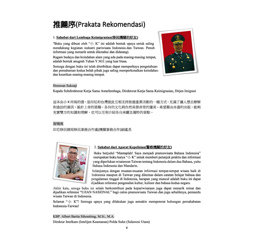 將印尼、台灣景點的資訊,包含在語言學習的筆記和印尼生活的體驗裡,希望本書能夠成為介紹這兩個國家語言、美食和文化的參考,期望藉由本書能越來越加強印尼與台灣的友好關係。