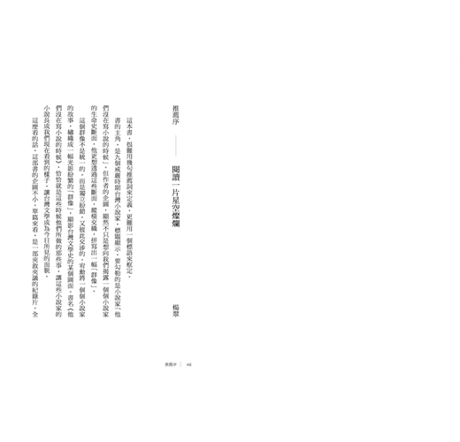 所以,我要邀請讀者一起閱讀的,除了書中九位小說家,他們不寫小說的時候,如何投擲肉身,為台灣文學闢造一方方麗園,還有為你們說故事的作者朱宥勳。他從一開始就把這本書定位為「評傳」(雖然我覺得這本書超過「評傳」的意義),小說家點評小說家,把自己也寫進去,把自己的思想路數、思考理路、情感流動,誠實地曝現在讀者面前。