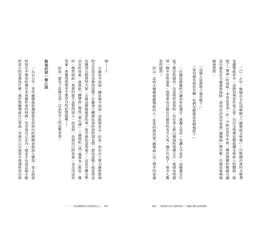 呂淑真不知道,國民黨不知道,這我很肯定。但是,站在台上努力應對質詢的文化局官員都知道嗎?在臉書上轉傳此事的我的朋友們,都知道嗎?我當然沒有傻到公開質問大家,去做這麼殺風景的事。我早就知道答案了。這是台灣文學共有的答案,就算把「鍾肇政」換成「葉石濤」、「鍾理和」或「聶華苓」都是一樣的。既然如此,重要的就不是質問別人,而是寫一份我自己的答案,並且用這份答案,來覆寫掉那本不應空白的記憶區塊⋯⋯