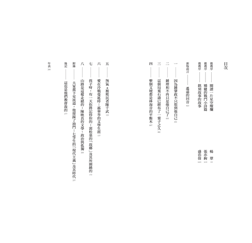 陳千武的開場很有意思,從他中學偷偷搭船前往日本,想到日本打天下,結果被父親請託船長,原船帶回寫起,可見作家之所以成為作家,並不都是從小立志,一往直前,此生不悔的,更可能是因為另一條路被堵住了,陳千武正是因為計畫受阻,才啟動了文學夢。寫聶華苓,開場就是一九六三年她與安格爾的相遇,全篇首尾放閃,有如一則愛情故事,但是,也正是這場世紀戀曲,才有了小說家不寫小說時所做的那些事,才將台灣文學的座標擴寫到世界。