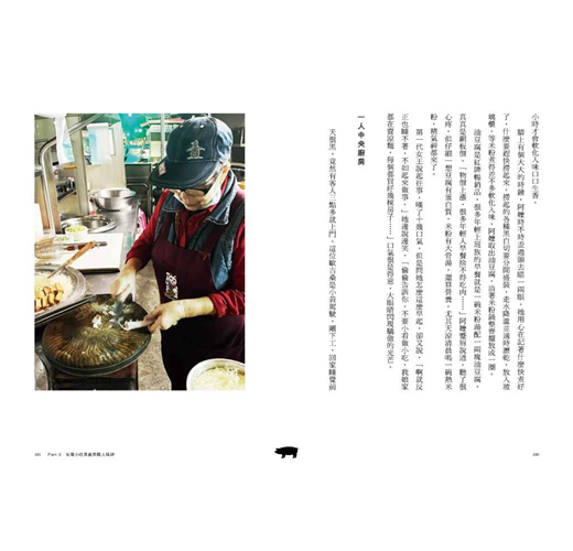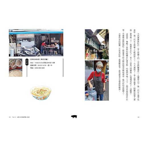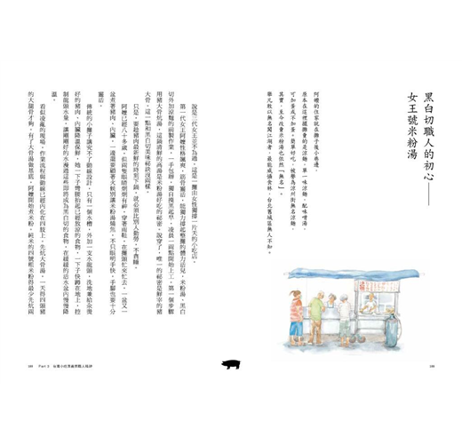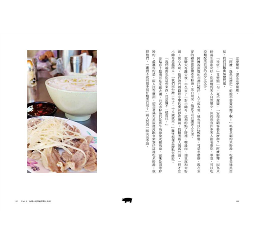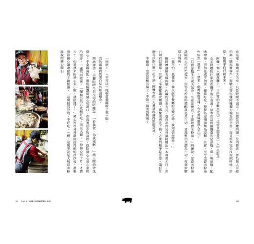 作者傅士玲明顯就是一位行家,在我的認知中「黑白切」是台灣小吃中看似最簡單、實則最困難的活兒,北部的米粉湯麵攤的清燙白切流的豬肉各部位的前處理、分類烹煮都有細功夫,要老經驗、要能堅持,同時早上開攤的一定要半夜黎明即起,選用溫體豬肉是好吃的唯一選擇。如果我們往南部走又是另一方光景,香腸熟肉流的黑白切攤子上,動輒數十種溫體肉類加工品與蔬食,主理人必須有辦桌大主廚的手藝與極為勤奮的精神,各項物料的準備及加工要比北部花更多時間料理,蟳丸、香腸、糯米腸、粉腸、豬肝切起來花一、兩百元即可獲得米其林般享受,配個冰台啤更是絕佳「餐酒搭配」(Pairing)!――沈方正(老爺酒店集團執行長)