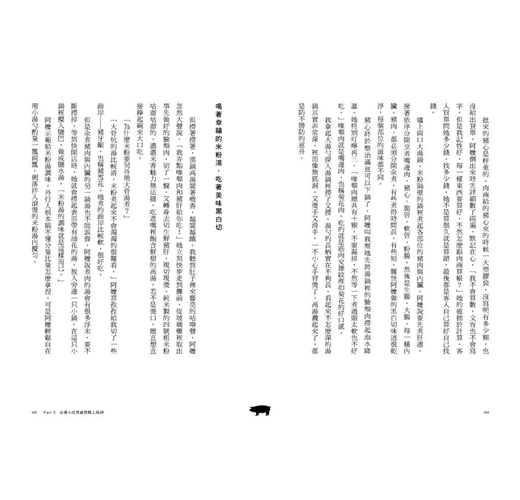 魚販不能單單賣一種魚。豬販單賣豬肉,肉能細分到肌肉部位,內臟如同解剖課本般細分。細分是為了口感與味蕾,豬肉不單只是豬肉。台灣人吃豬,卻也貶低豬,在高級餐廳最高檔的豬不是台灣的,最好的肉也不會是豬肉。吃黑白切時,豬的一切都任君挑選,甚至為了吃某些部位,還得成為熟客或特別早起。本書說起吃豬的那些大小事,也讓人按圖索驥吃遍台灣,讓我們吃得像豬一樣,同時,也讓我們食豬、識豬。――林楷倫(《偽魚販指南》《雪卡毒》作者)