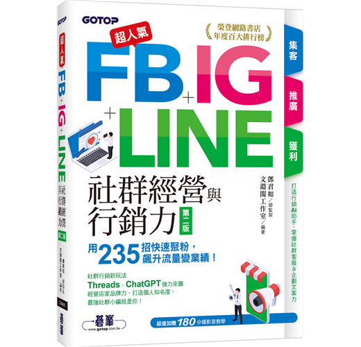 綜合 Facebook、Instagram、LINE 三大超高人氣社群工具,集結 12 章、共 235 個的行銷技法,讓你學會三個社群平台的運作模式及優化技巧,外加Threads、ChatGPT兩大熱門工具,精準掌握品牌與個人行銷要訣,有效提升銷售業績!