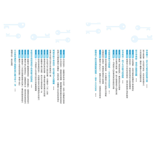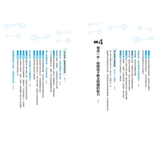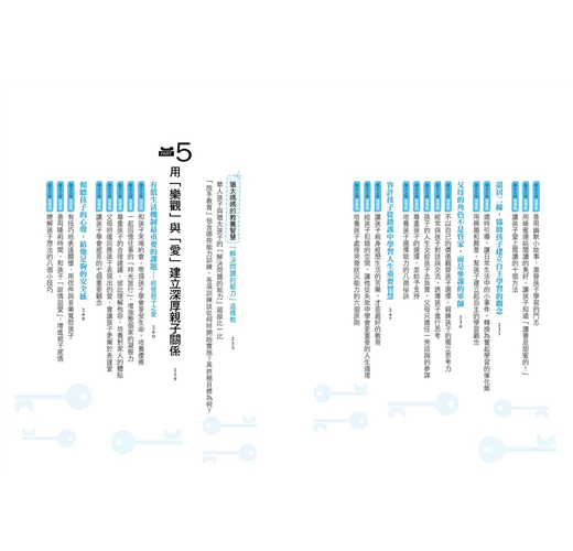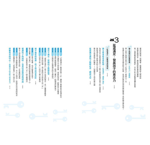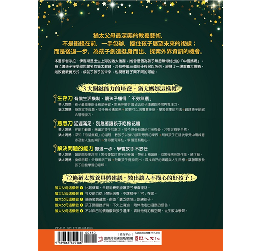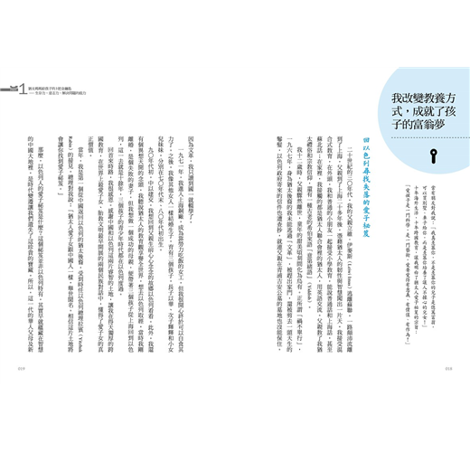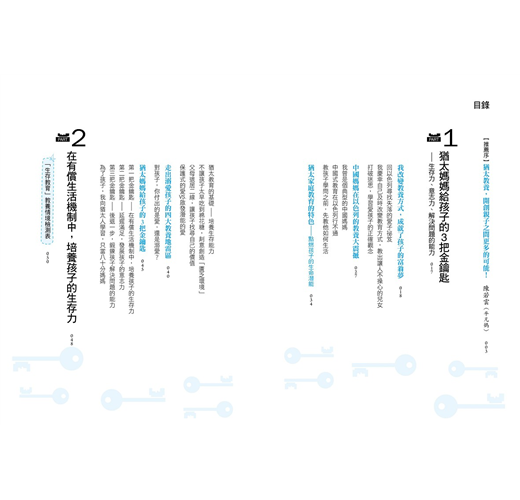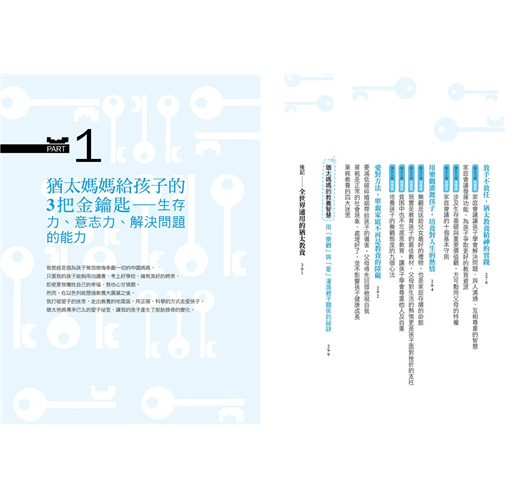 2. 本書主要章節前均附【教養情境測驗表】,供家長釐清自己的教養態度與做法;書中共有72則【猶太父母這樣做】,提供爸媽實踐猶太教養時的具體建議與做法;各章後的【猶太媽媽教養智慧】則總結該章節的重點內容,除了清楚點明在猶太教育下長大的孩子與一般華人孩子的不同之處,還有各項訓練的目標與建議開始時間的提醒。