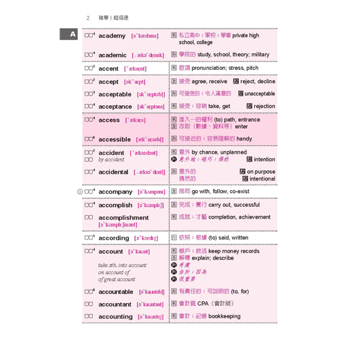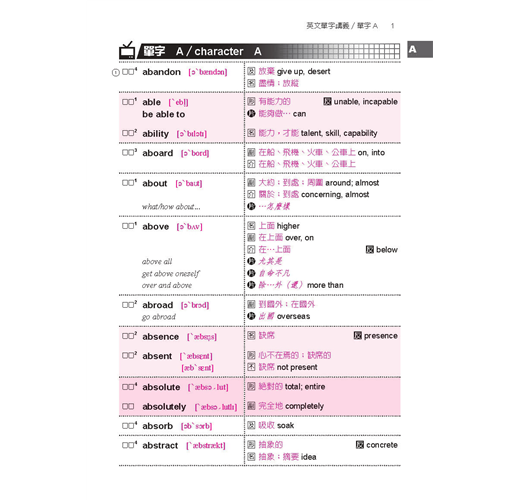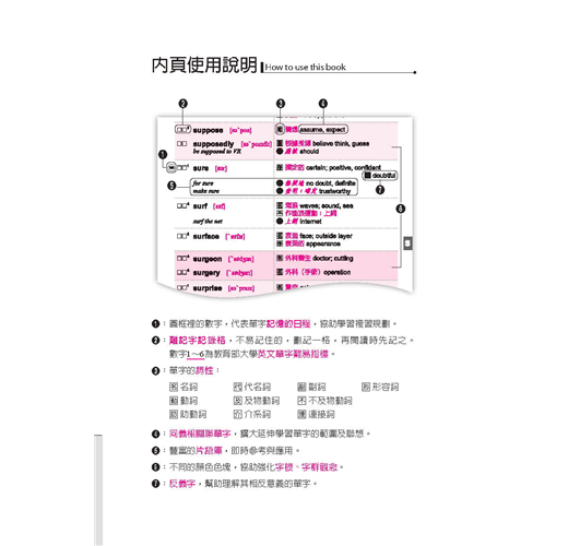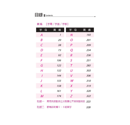 ※ 為充分使用印刷空間,並給讀者較多的相關英文單字,所以右方欄位的英文字譯與中譯及詞性就沒有辦法完全對齊;讀者若有疑慮,請參考網路字典。