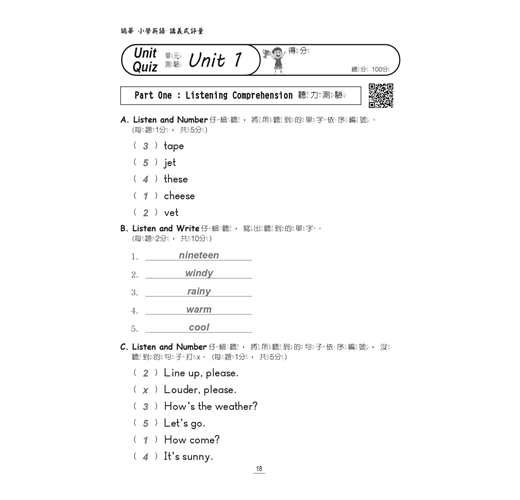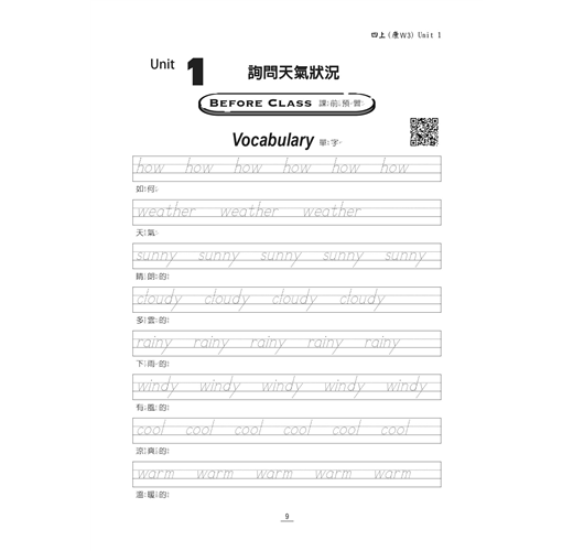 ★ 每一課文法句型、課課練單字、字字QR Code、兩次段考試題,加強英語有效學習及書寫的能力!