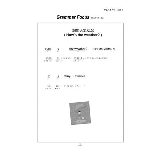 1. 直譯法。將英文字句,用直譯中文的方式呈現。讓學生自然輕鬆的學習英文的語法順序結構。再附註中文翻譯,讓孩子輕易完全了解英文句子特有的組成方式。