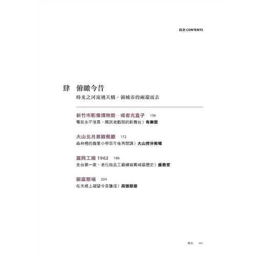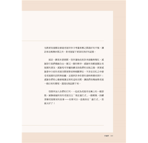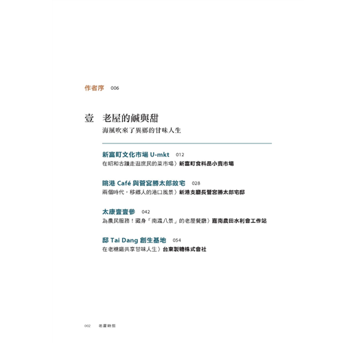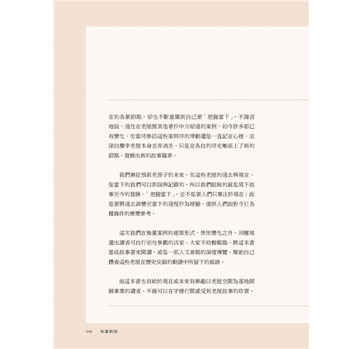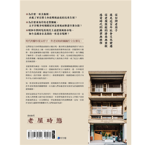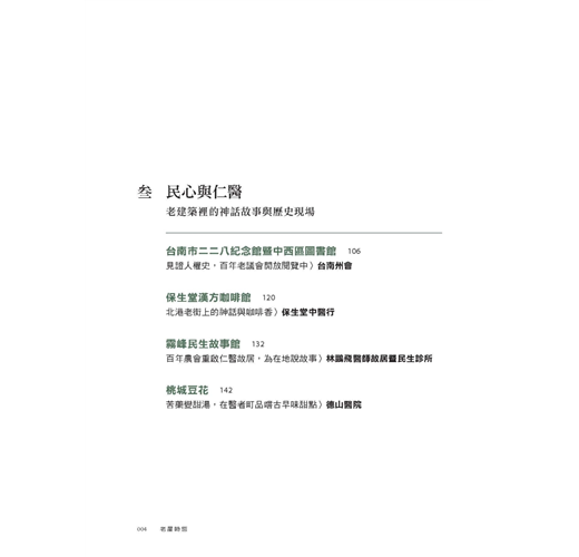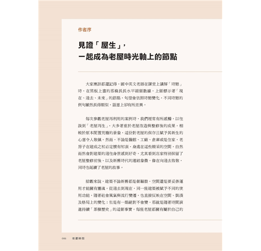 本書的「老屋時態」,為老屋顏團隊走訪全台一度閒置荒廢、而後修復重啟的老屋後,對照這些老房子在不同時代下的今昔角色轉換、特色功能與建築元素演變,所做的深度考察紀錄。