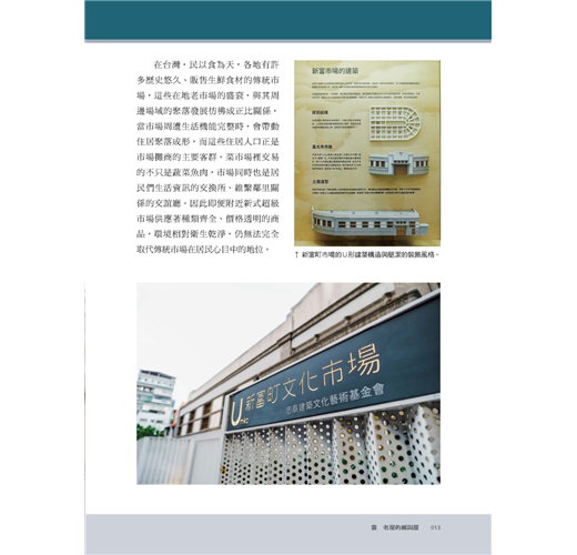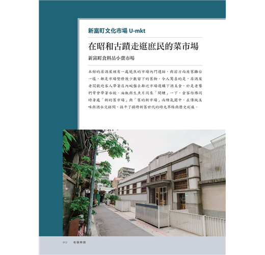 這一次,老屋顏團隊從踏點老屋、介紹老件,更進一步串起老屋今昔時光。從建築形式結構、風格特徵、空間格局、設計裝飾、建材作工演變,以至於修復整建歷程一一細述,揭露隱藏在老房子內外的功能性設計,例如日治市場馬蹄形動線的視覺感與高機動性、向東京銀座取經的挑高天井與空中拱廊設計。