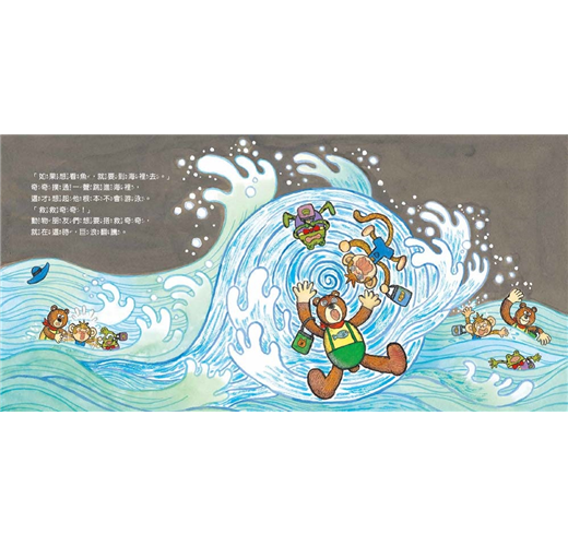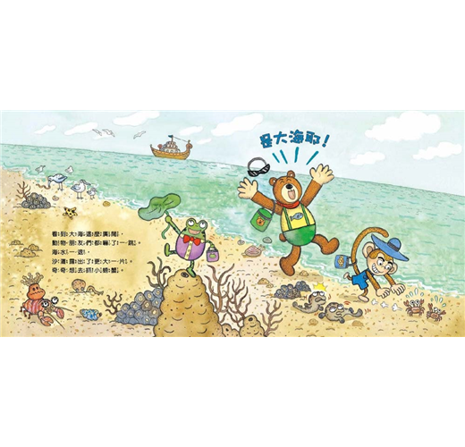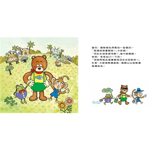 這天,動物們聚在一起聊天,大吉看著印有魚的衣服說:「我真的好喜歡魚!」普卡接著說:「活生生的魚更可愛!」於是,奇奇提議:「那麼我們到海邊看看活生生的魚吧!」