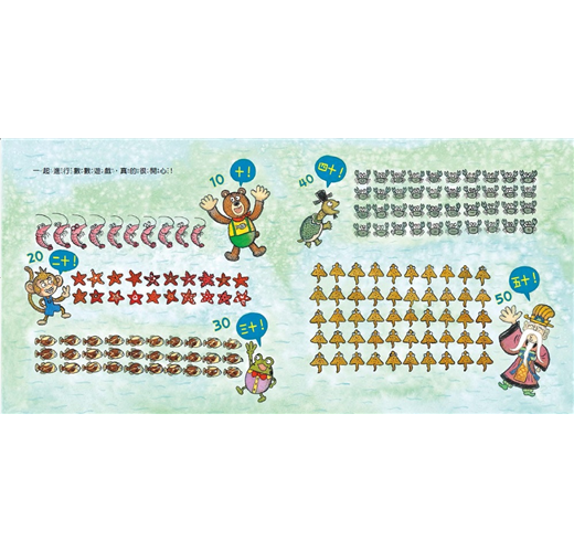 ※這是一本蘊含計量與數數方法的繪本,陪同孩子閱讀時可隨著繪本故事情節發展,10個1等於10,20個1等於20……反覆地數數,不斷地幫助孩子理解十進位概念,及建立數數和運算的基礎。