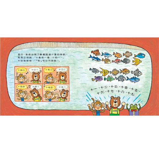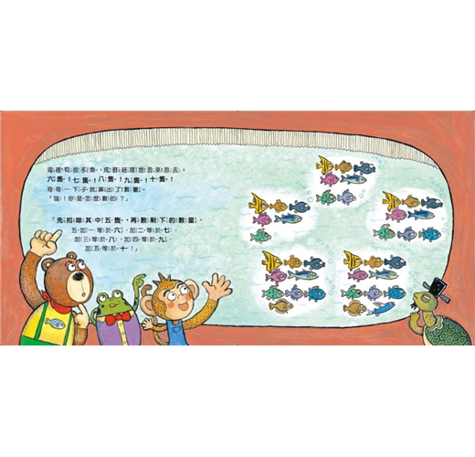 一陣巨浪翻騰,鯨魚張大了嘴把動物們都吞進了肚子裡,動物們從鯨魚齒縫間,看到海裡有好多成群結隊游來游去的魚群。當大家都認真地數著魚群時,奇奇很快地用5 加1等於6,5加2等於7……數完魚群的數量。來到龍宮後,奇奇很快地就發現龍王暈眩的原因,於是奇奇教了海底生物每10隻排成一排的方法,並教龍王以10個一數的方式來數魚群,很快地龍王的暈眩症就好了。