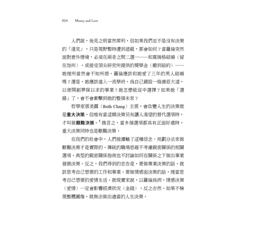 人的一生中,一定會遭遇在金錢與愛情之間拉扯的決策。你要選人生伴侶還是事業?你要結婚嗎?想生小孩嗎?如何照料生病或失能的家人,或是如何面對自身的疾病或失能?要如何分配家務?如何與何時該轉換跑道?要不要追求升遷?如何兼顧育兒與事業?等父母年紀漸長,需要照護長者,甚至做生命終點規劃。當我們年華老去,則必須經營退休後的人生,也包括照護人生伴侶。