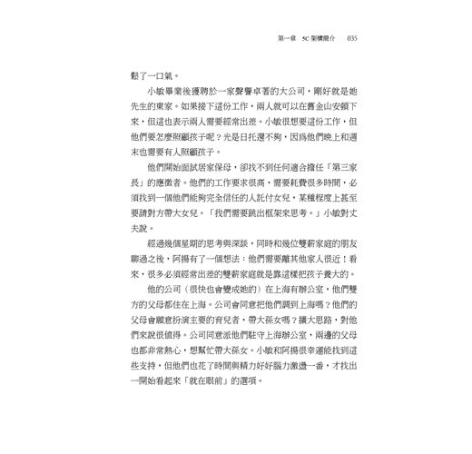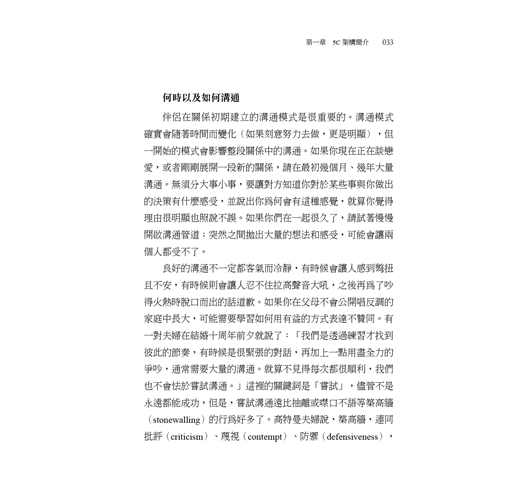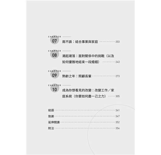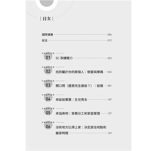 國際讚譽 前言 第一章 5C架構簡介 第二章 找到屬於你的那個人:戀愛與擇偶 第三章 開口問(還是完全避談?):結婚 第四章 來談談寶寶:生兒育女 第五章 來協商吧:家務分工和家庭管理 第六章 沒有地方比得上家:決定居住地點和搬家時間 第七章 兩不誤:結合事業與家庭 第八章 潮起潮落:面對關係中的挑戰(以及如何優雅地結束一段婚姻) 第九章 熟齡之年:照顧長輩 第十章 成為你想看見的改變:改變工作/家庭系統(你要如何盡一己之力) 結語 致謝 延伸閱讀 附注