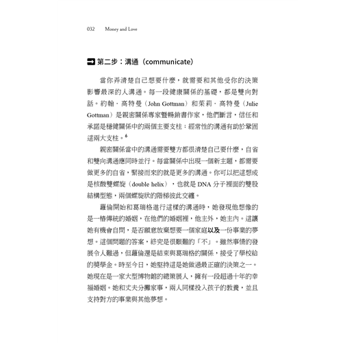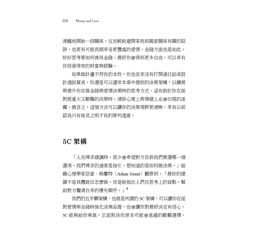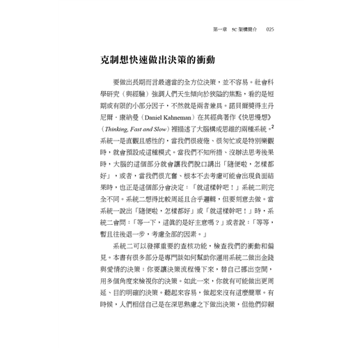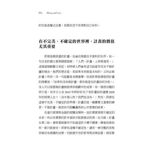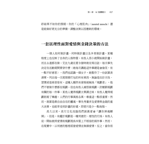 人們說,後見之明當然犀利,但如果我們並不是沒有決策的「遠見」,只是視野暫時遭到遮蔽,那會如何?當蘿倫突然面對意外情境,必須在兩者之間二選一──和葛瑞格結婚(留在加州),或接受頂尖研究所提供的獎學金(搬到紐約)──她理所當然會不知所措。蘿倫應該和她愛了三年的男人結婚嗎?還是,她應該進入一流學府,為自己鋪設一條康莊大道,以便開創夢寐以求的事業?她怎麼能從中選擇?如果她「選錯」了,會不會衝擊到她的整個未來? 哲學家張美露(Ruth Chang)主張,會改變人生的決策就是重大決策,但唯有當這類決策另有讓人渴望的替代選項時,才叫做艱難決策。換言之,當多個選項都具有正面好處時,重大決策同時也是艱難決策。 在我們的社會中,人們被灌輸了這種信念:用劃分法來做艱難決策才是實際的。傳統的職場思維不考慮親密關係的相關選項,典型的親密關係指南也不討論如何在關係之下做出事業發展決策。反之,我們得到的忠告是,要做專業決策的話,就該思考自己想要的工作和事業;要做情感面決策的話,理當思考自己想要的愛情生活。就現實來說,以蘿倫為例,情感決策(愛情)一定會影響經濟狀況(金錢),反之亦然。如果不檢視整體圖像,就無法做出適當的人生決策。 ▌克制想快速做出決策的衝動 要做出長期而言最適當的全方位決策,並不容易。社會科學研究(與經驗)強調人們天生傾向於狹隘的焦點,看的是短期或有限的小部分因子,不然就是兩者兼具。諾貝爾獎得主丹尼爾.康納曼在其經典著作《快思慢想》裡描述了大腦構成思維的兩種系統。系統一是直觀且感性的,當我們很疲倦、很匆忙或是特別樂觀時,就會預設成這種模式。當我們不知所措、沒辦法思考後果時,大腦的這個部分就會讓我們脫口講出「隨便啦,怎樣都好」,或者,當我們很亢奮、根本不去考慮可能會出現負面結果時,也正是這個部分會決定:「就這樣幹吧!」系統二則完全不同。系統二想得比較周延且合乎邏輯,但要刻意去做。當系統一說出「隨便啦,怎樣都好」或「就這樣幹吧!」時,系統二會問:「等一下,這真的是好主意嗎?」或者說:「等等,暫且往後退一步,考慮全部的因素。」 系統二可以發揮重要的查核功能,檢查我們的衝動和偏見。本書有很多部分是專門談如何幫助你運用系統二做出金錢與愛情的決策:你要讓決策流程慢下來,替自己挪出空間,用多個角度來檢視你的決策。如此一來,你就有可能做出更周延、目的明確的決策。聽起來容易,做起來沒有這麼簡單。有時候,人們相信自己是在深思熟慮之下做出決策,但他們仰賴的仍是直覺式反應,長期而言不見得對自己有利。 ▌在不完美、不確定的世界裡,計畫的價值尤其重要 即便是最詳盡的計畫,也會出現最出乎意料的失序。有一句古老的猶太意第緒諺語說:「人們一計畫,上帝就發笑。」這個道理動聽又易記,有時候人們會用這句話當作完全不做計畫的理由,他們的想法是:若結果本來就是未知的,又何必做計畫?然而,另一句話雖是老調重彈,但或許更能捕捉到計畫的現實面:「如果你沒有做計畫,那你就是在計畫如何失敗。」沒人可以保證做計畫就能得到規劃中的成果。有一個很切題的例子是:有多少人在2019 年時好好坐下來計畫如何適應2020年的疫情人生?(沒半個人吧?我們也沒有。)然而,即便在這個不完美、不確定的世界裡,計畫仍是一種寶貴又重要的練習。不做計畫,就很有可能無法得到心中想要的結果。 在進行愛情與金錢的相關決策時,由於需要預測不確定的未來,所以你需要的許多資訊可能都無法取得。比方說,計畫生第二胎,意味著就算你不知道這孩子健不健康、脾氣性格如何,都只能接受。即便有這種不確定性,運用一套完整的流程來做出有意識的決策,仍能提升你的思考與決策品質。倘若最終結果不如你的預期,你的「心理肌肉」(mental muscle)還是能做好更充分的準備,調整決策以因應新的環境。 ▌一套以理性面對愛情與金錢決策的方法 一個人如何做計畫、何時做計畫以及多常做計畫,某種程度上也反映了自身的人格特質。有些人很小就開始做計畫,而且永遠都在做。艾比九歲在夏令營時就在寫日誌,每天事先決定在活動期間要穿什麼(她每次講起這件事總是會偷笑,有一點不好意思)。我們也認識一個女子,她製作了一份試算表清單,列出每一次度假要打包的所有東西。無論是出於天性、習慣或是兩者皆有,這種人顯然有資格被稱為「規劃者」,他們不管做什麼都在規劃。但也有些人痛恨做規劃,討厭跟規劃有關的每一件事。某些人覺得規劃太單調乏味,有些人覺得規劃扼殺了樂趣。人們的行事風格各異,尊重這一點很重要。然而,就算是最自由自在的靈魂,事先考量涉及愛情與金錢的重大決策,也能享受到計畫的好處,即使只是少一點後悔。 長久以來,流行文化洗腦我們說真愛會「讓你神魂顛倒」,但是,有鑑於規劃是一種刻意的、理性的行為,有些人從一開始就將愛情和規劃視為本質上不相容的兩件事。然而,在現實中,以刻意的態度經營愛情並無損愛情,反之,當你很清醒地開始一段關係,反而較能避開某些和親密關係有關的陷阱,也更有可能長期享受更豐盛的愛情。金錢方面也是如此。好好思考要如何善用金錢,最終你會得到更多自由,可以享有你投資得來的財富與經驗。 如果做計畫不符你的本性,你也從來沒有打開過日