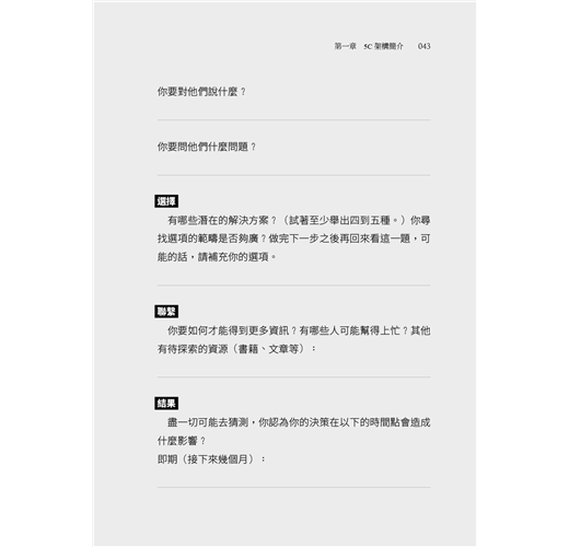 你可以用5C架構決定人生中最重要、但也最艱難的問題:要不要跟這個人結婚、生小孩;住在哪裡、要不要搬家;如何結合工作與家庭、事業與育兒;如何在必要時結束不良的關係;何時退休、晚年生活、長照方式、遺囑與遺產等。