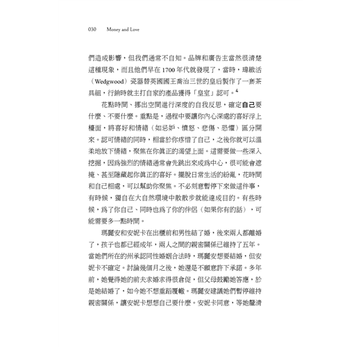 前言(節錄) 蘿倫眨了眨眼,忍住淚水,她不懂,今天發生的事明明都是快樂的事,但為何她這麼不快樂?紐約一家頂尖的研究所決定錄取她,還給她全額獎學金,一毛不少,過沒多久,她相戀 三年的男友葛瑞格跑來告訴她說他不能離開加州,因為他最近升職了。出乎她意料之外的是,接著他單膝跪下,向她求婚。 能進入研究所,以及等到葛瑞格向她求婚,都是蘿倫期盼已久的夢幻時刻,但現在,這兩個令人興奮的消息並沒有帶給她想像中的快樂。她真的需要在愛情和事業之間擇一嗎?就在這一天,蘿倫必須和金錢與愛情之間錯綜複雜、且通常極具挑戰性的關係正面對決。她要選哪一邊?更重要的或許是,面對這個令人苦惱的問題時,她應該如何做決定? 人的一生中,一定會遭遇類似在金錢與愛情之間拉扯的、令人揪心的決策。你要選人生伴侶還是事業?除此之外,你可能也必須選擇要不要結婚,或是要不要生兒育女;如何照料生病或失能的家人,或是如何面對自身的疾病或失能;選擇要住在哪裡;決定如何分配家務;決定要不要追求升遷或爭取重要職務;調和不同的花費、儲蓄和投資習慣;決定要不要兼顧育兒與事業、要的話又該如何做;要如何以及何時轉換跑道。我們可能也需要想想如何強化或結束一段關係。等父母年紀漸長,我們或許需要幫忙照護長者、做生命終點規劃。當我們自己年華老去,則必須管理退休後的人生,其中可能包括照料人生伴侶。 這類選愛還是選錢的決策絕對不簡單,如今我們還得在快速且大幅變動的時代下因應問題。新冠肺炎疫情迫使幾百萬人必須在廚房、客廳或臥室裡架起工作站,同時還要照顧一家老老小小。一時之間,工作/生活可以區分開來的假象被戳破了,我們再也無法假裝看不見生活中各個面向的緊密相連。疫情也迫使幾百萬人重新評估自己要在哪裡工作、過什麼樣的生活。隨著現實條件逐步演進,我們面對的選錢還是選愛的決策,很可能是一張極為冗長的清單,涉及更多複雜層面: • 雙薪家庭的常態將會繼續變化。疫情之前,全職爸爸的人數已經逐漸增加,這股趨勢會不會延續下去,甚至加速發展?在疫情高峰期選擇退出工作崗位的女性,有多少人會重返職場,這又會造成什麼樣的狀況? • 在一個愈來愈趨於科技導向的經濟體裡,某些工作會慢慢消失,同時創造出新的工作。 • 遠距工作者的族群顯然會愈來愈龐大。已經罹患視訊會議疲勞(Zoom fatigue)的人請舉手,開始出現豔羨居家辦公症候群(home office envy)的人也請舉手。 請放心,本書並不會一直傳達負面訊息,然後要讀者練習接受,事實上恰恰相反,這是一本指南書,引導你穿越這類選愛還是選錢的迷霧,做出決定。我們不會告訴你決定要什麼,這只有你自己可以決定。反之,我們提出架構、相關研究與各種練習,幫助你找到自己的優先要務,讓你做出契合你心之所欲的決策。你會得到什麼?你會覺得更輕鬆自在,感受到更多的昂揚自信,知道即便你的人生會受到無法掌控的外部因素所影響,你仍能用一套穩健、經過驗證的架構來調整走向。一點一點,一步一步,你將能讓人生更接近重要的目標與夢想,更深切感受到人生操之在我,而且能掌控的不只某個單一面向;你將更能決定人生幾個最重要的部分,以及如何讓這些面向相輔相成,以成就此生的旅程。 充滿挑戰的時刻會促使我們重新評估人生,最終得出更好的結果。1970 年,本書作者暨勞動經濟學家麥拉當時的雇主加州大學柏克萊分校告知她,說她無法獲得終身職(tenuretrack),因為她是一個育有兩名幼子的母親。她下定決心克服這種偏見,便以家庭和工作為題,寫出一套專題研討提案;專題研討通過審核,很快就變成一門完整的課程。兩年後,加州大學柏克萊分校要提供她終身職,但她拒絕了,轉而成為史丹佛商學研究所有史以來第一位女性教職員。在接下來數十年裡,她帶領數千位學生修習這門工作與家庭(Work andFamily)課程,廣受好評,最終激發出了這本書。麥拉於2018年退休,擔任史丹佛教育學院與商學院的終身教授。 麥拉教這門課教了40年,期間不斷更新內容,以反映她自己與其他人的生活經驗,以及來自客座演講人的新研究和專業知識。 工作與家庭這門課長期受到歡迎,部分理由是麥拉一貫但又靈活的教法。一直以來,她堅守自己的核心原則:直接從事實出發,就事論事;仰賴可靠的數據資料,但仔細檢視其限制;善用個人觀點與經驗作為討論的素材;給學生力量,讓他們在家庭、職場和社會不斷變化的環境中接納自我。 從開設這門課算起,修過課的學生已達數千人,分別來自不同的種族與族裔背景;有女性、男性與非二元性別人士;有單身者、戀愛中或已婚者;還有各種性傾向不同的學生。當中有很多人都對麥拉說,這門課是他們修過最有用的課之一。即使已經畢業多年,他們還是會來信,說這門課讓他們做好更充分的準備以面對人生,獲益超越任何大學部或研究所的課程,而他們畢業之後仍在運用過去學到的資訊和方法。 ▌如何使用本書 本書旨在提出一套因應自身目標與優先順序的獨特整合性決策方法。人生的不同面向會隨著時間階段而有高低起伏,你可能會發現某些章節讀來特別有共鳴。我們會在第一章提出5C決策架構,讀完本章之後,你可以自行選擇按順序讀下去,也可以跳到你在特定時候覺得特別與你切身相關的章節。 本書一開始就會提出這套架構;已經有